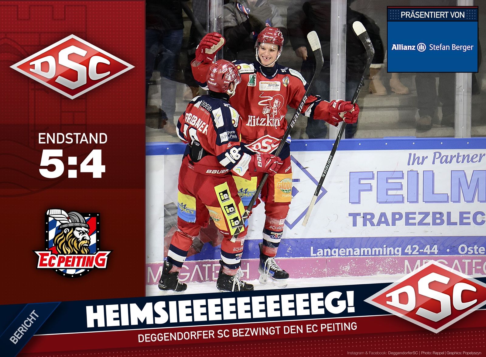 Der Deggendorfer SC sackte am Sonntagabend die nächsten drei Punkte ein. Vor 1.842 Zuschauer bezwang das ersatzgeschwächte Team von Casey Fratkin den EC Peiting in einer hart umkämpften Partie am Ende mit 5:4.