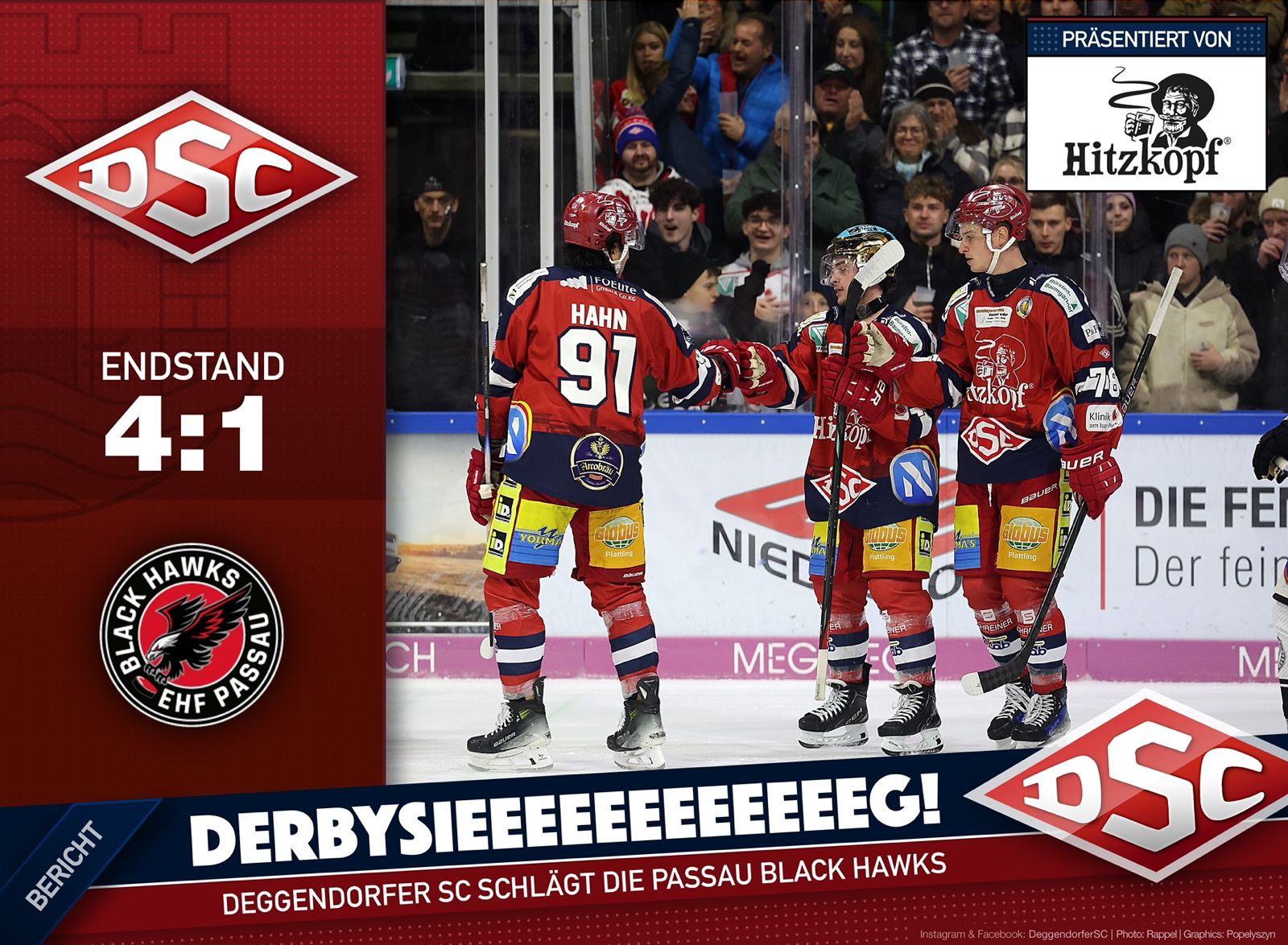 Derbysieg für den Deggendorfer SC! Vor ausverkauftem Haus bezwang das Team von Trainer Casey Fratkin die Passau Black Hawks mit 4:1 und feiert damit ein Sechs-Punkte-Wochenende.
