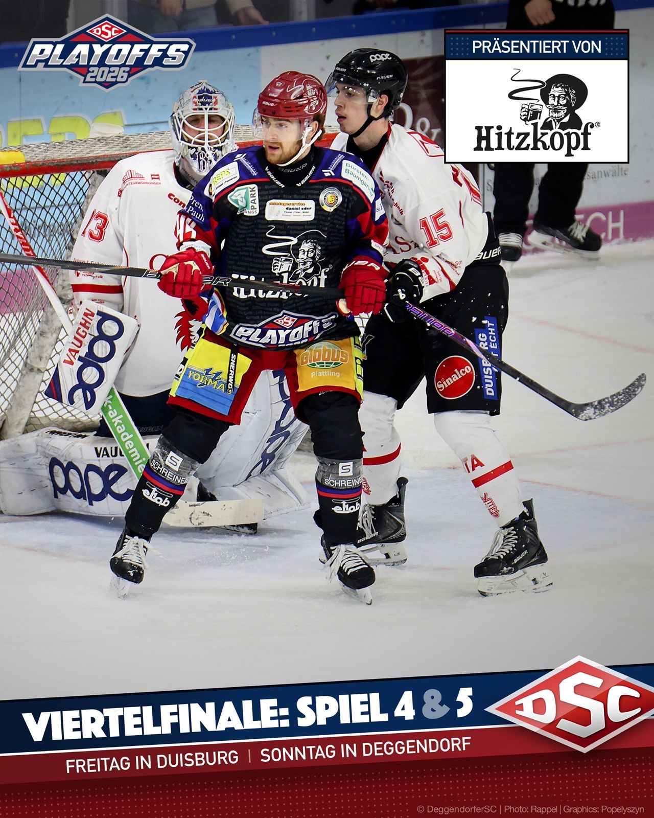 Mit einem knappen 4:3-Overtime-Erfolg sicherte sich der DSC zuletzt die 2:1-Serienführung und verschaffte sich damit eine hervorragende Ausgangsposition. Dennoch bleibt die Serie offen – auch weil sich die personelle Situation bei den Hausherren aus Duisburg etwas entspannt. Coach Frank Petrozza kann nach deren Sperren wieder auf Carter Popoff und Luis Üffing zurückgreifen. Ob darüber hinaus Förderlizenz-Unterstützung zur Verfügung steht, ist derzeit noch unklar. Allerdings müssen die Füchse am Freitag auf Verteidiger Pascal Grosse verzichten, der nach seiner Spieldauer-Strafe aus Partie drei gesperrt fehlt. Auf Seiten der Niederbayern muss Luca Zitterbart noch ein Spiel Sperre absitzen und wird erst am Sonntag wieder vor Goalie Timo Pielmeier verteidigen können.